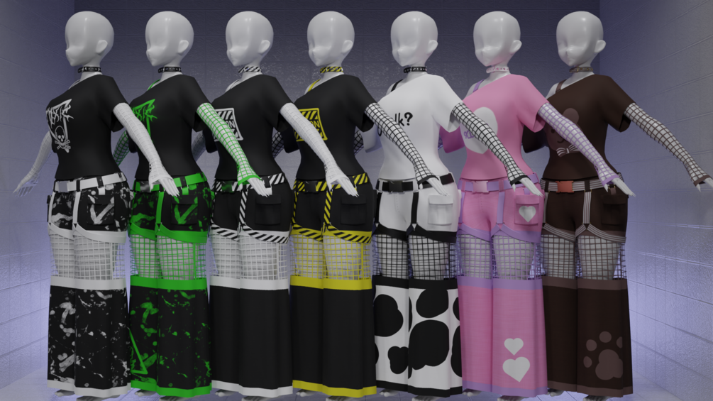For both the Rave Pants and Fishnet Sleeves materials, I recommend using the "Alpha Clip" blend mode. For all other materials, use "Opaque." This can be changed in the "Material Properties" tab in Blender.