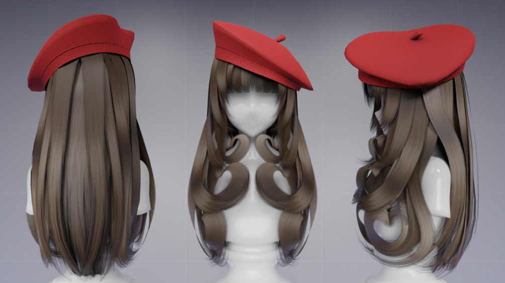 A long hairstyle with bangs, heart-shaped layers, and a matching beret!