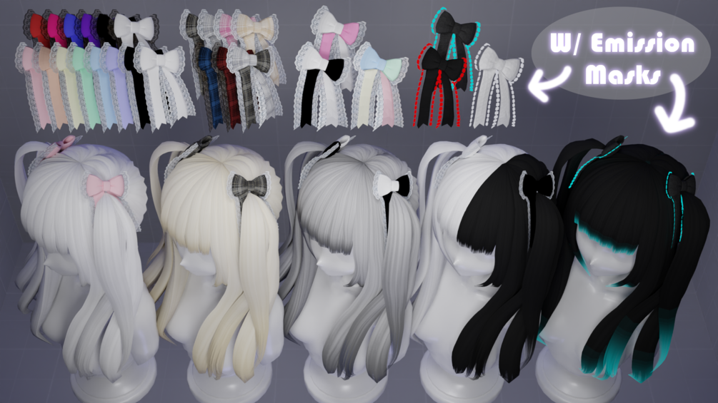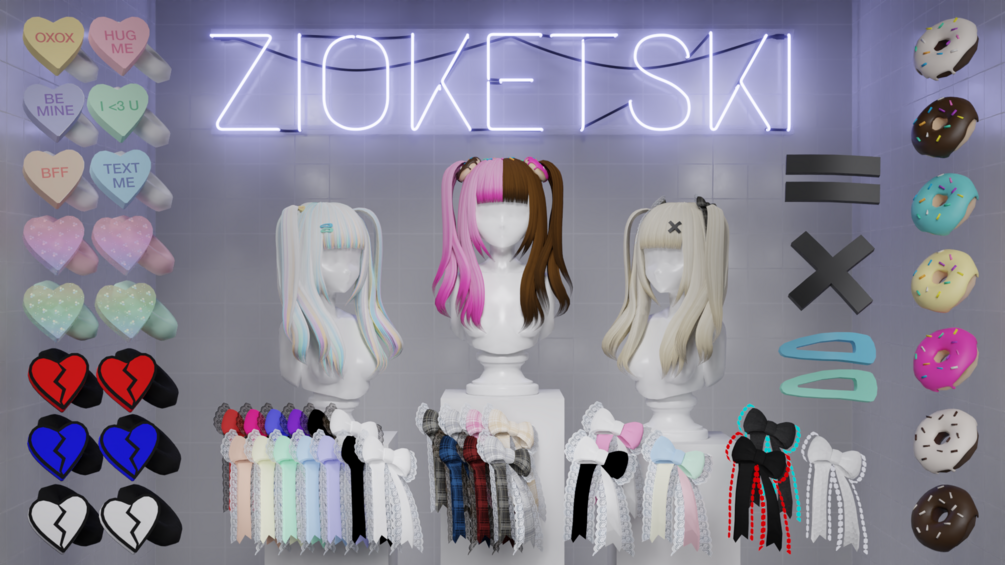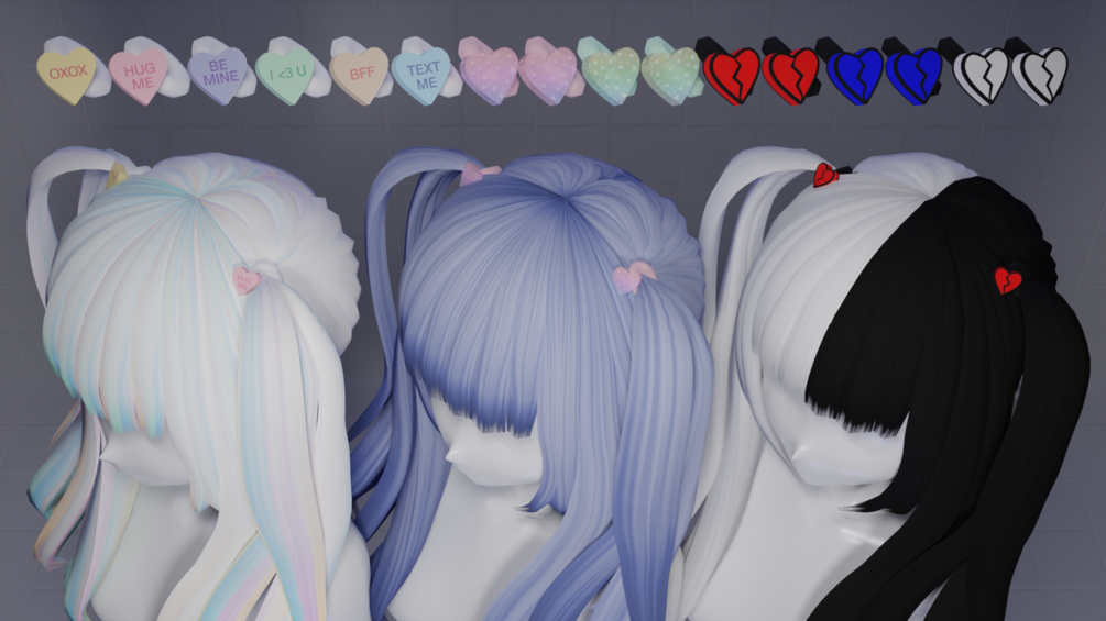 ~~~~☆Textures: 3 Candy Heart Textures, 2 Crystal Heart Textures (extra textures without glitter, also), and Broken Heart Textures w/ emission mask. Includes flipbook texture* of the 3 Candy Heart Textures and roughness map. Masks for individual pieces (lineart on Broken Heart Texture, scrunchie, both hearts and separate L/R hearts).