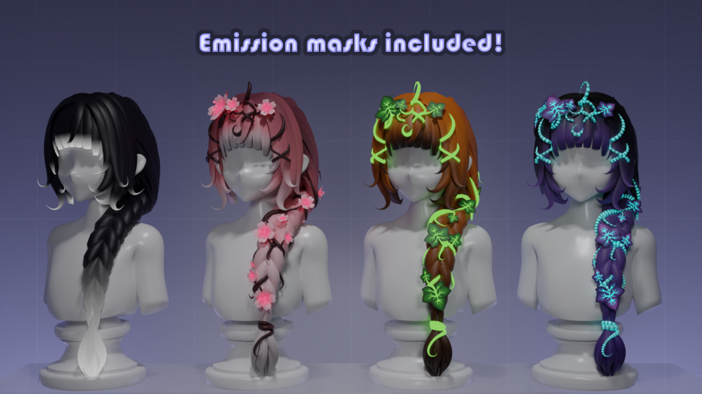🌿 Hair textures include 11, 1k albedos, normal map, & emission mask.