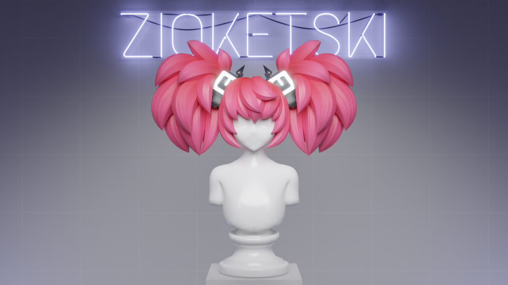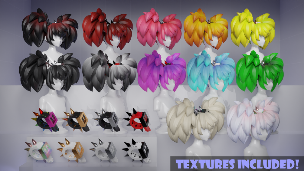 - Hair material includes 1k albedos, normal map, & emission mask.