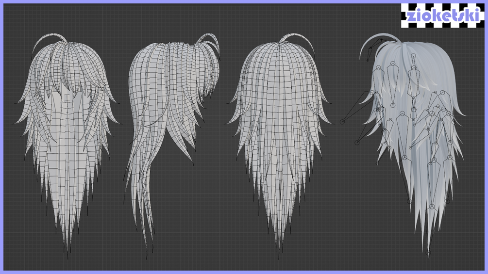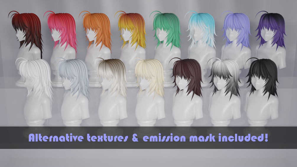 - Hair textures include 15, 1k albedos, a 1k normal map, & a 1k emission mask.